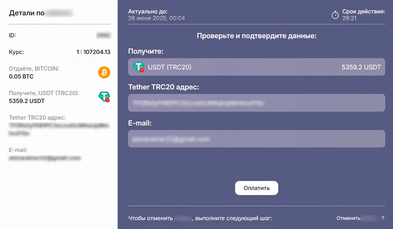 - После этого будет сформировано автоматическое подтверждение заявки. Необходимо проверить детали операции. При обнаружении ошибки можно отменить обмен, нажав на кнопку внизу формы. Если все верно, нужно кликнуть по клавише «Оплатить».