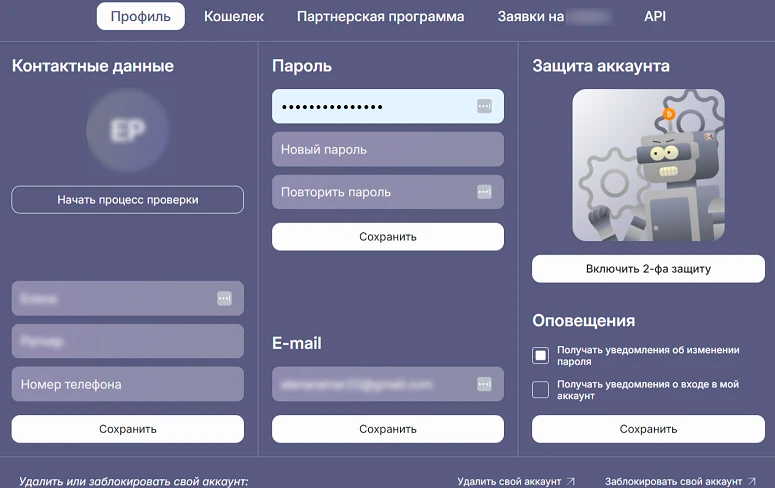 Партнерский кабинет представляет собой платформу для привлечения рефералов. Вверху страницы находятся блоки для управления выводом, ставкой и скидкой на обмен. Участники реферальной программы могут снимать заработанные средства в любое время, выбирать методику начисления наград, а также регулировать условия снижения комиссий.