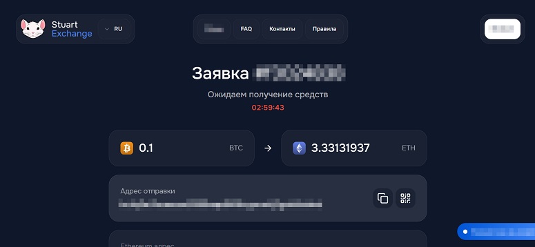 Время поступления денег варьируется в зависимости от конкретной криптовалюты. Обменник StuartExchange предупреждает, что в среднем средства зачисляются через 5-60 минут с момента поступления платежа от клиента. Задержки зачастую связаны с загруженностью блокчейна либо с неполадками на стороне банка.