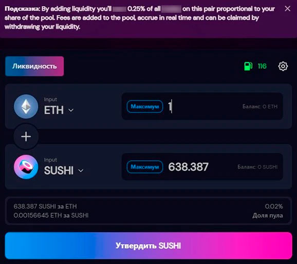 - Внести цифровую валюту, получив взамен токены ликвидности.