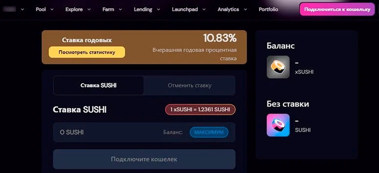 Годовая процентная ставка фарминга на криптобирже SushiSwap составляет от 0,49 до 37,74%. Важно учитывать, что вознаграждение выплачивается в SUSHI. После вывода активов из стейкинга их цена может отличаться от стартовой, поэтому инвесторам следует выбирать наиболее стабильные криптовалюты.