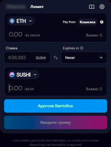 При выставлении лимитного ордера трейдер указывает желаемый курс конвертации. Средства вносятся на баланс кошелька BentoBox и блокируются на нем после отправки заявки. Как только котировки цифровой валюты достигнут указанной отметки, токены передаются в пул и происходит обмен.