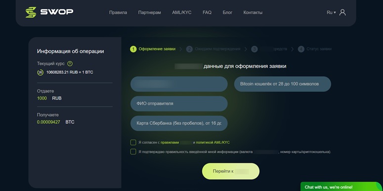 - Курс фиксируется в момент, когда клиент подает заявку. Однако платформа вправе менять его на свое усмотрение (например, если цена криптовалюты резко меняется).
