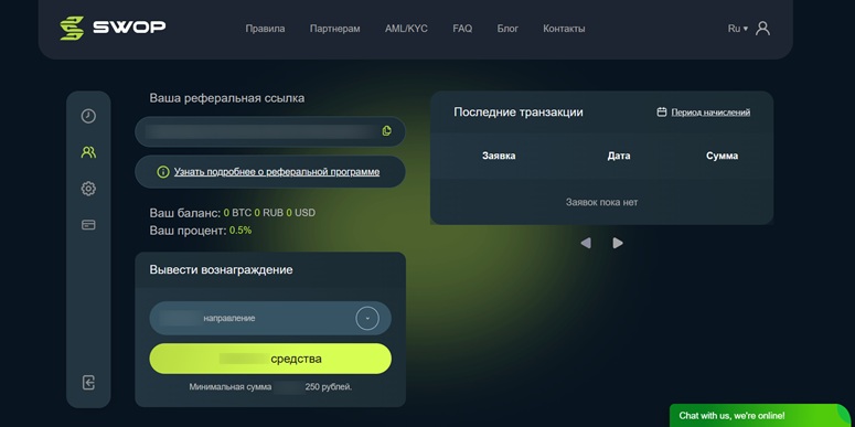 Зарегистрированным пользователям предлагается реферальная программа. В рамках нее можно привлекать на официальный сайт обменника SWOP новых клиентов и получать процент от каждой их сделки. Базовая ставка составляет 0,5% от оборота рефералов.