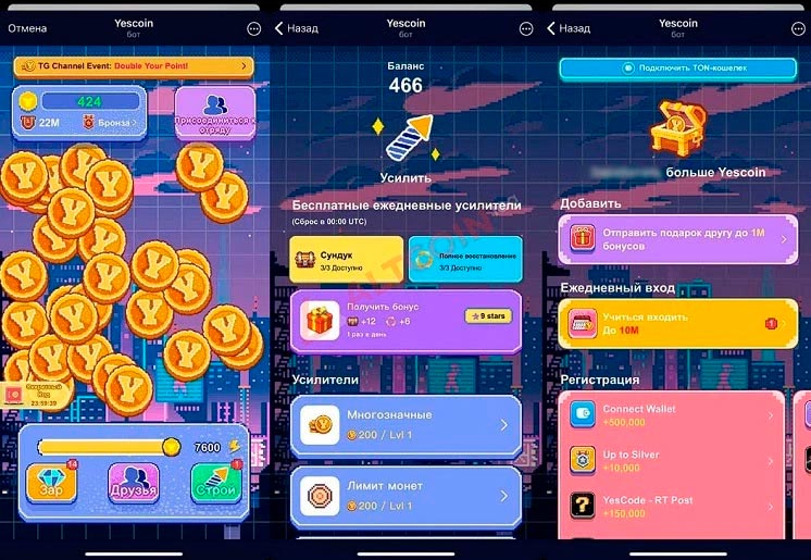 | Процесс похож на проект Notcoin. Участникам необходимо нажимать на изображение монеты. | ||