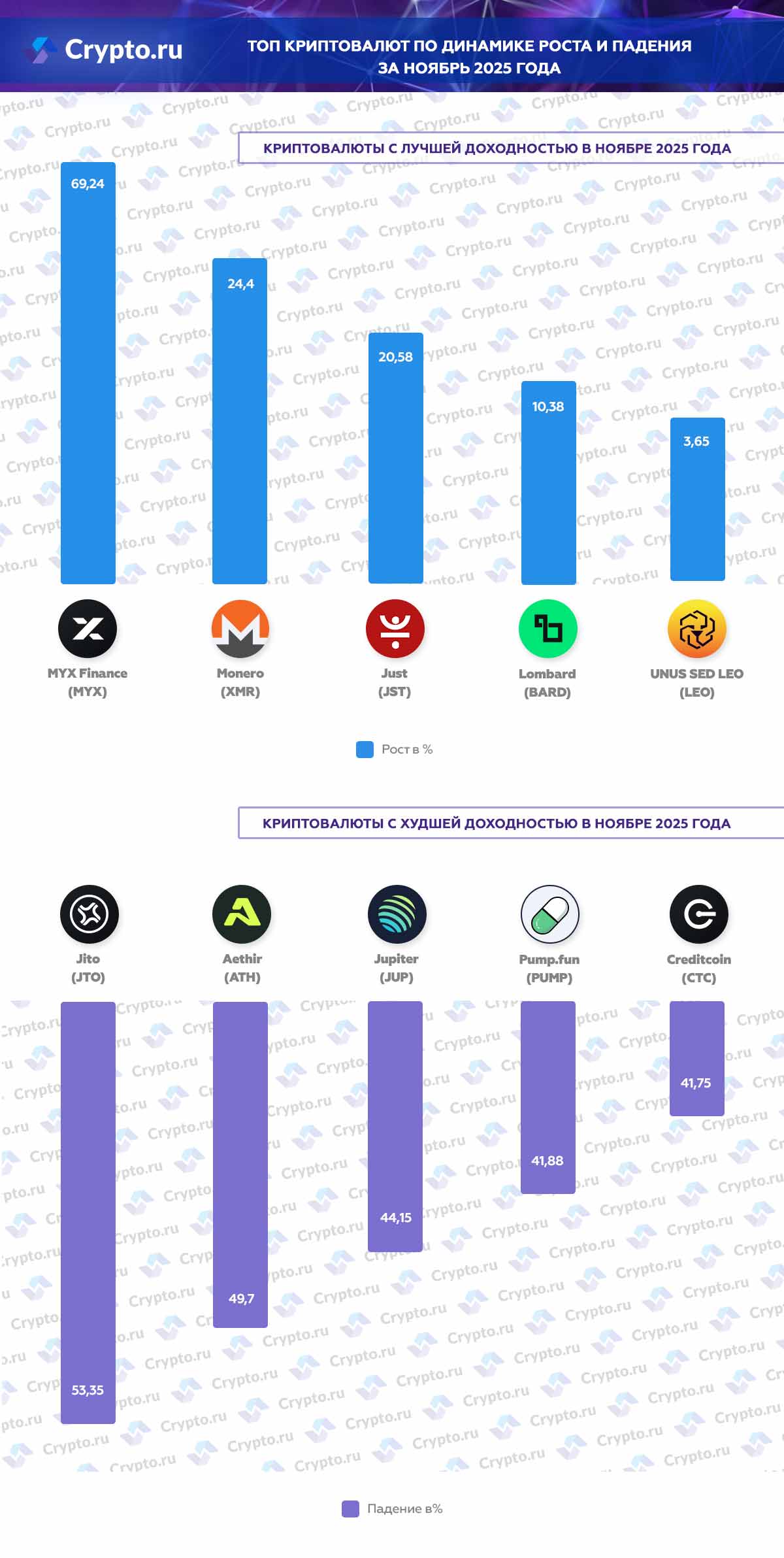 Топ криптовалют по динамике роста и падения за ноябрь 2025 года