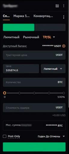 - В меню установки ордера следует открыть вкладку TP/SL.