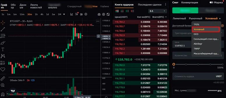 Открыть любой ордер с триггерной ценой на Bybit на споте можно в торговом терминале. Разнятся только параметры, которые пользователь выставляет при размещении своей заявки. Ниже представлены подробные руководства для всех разновидностей.