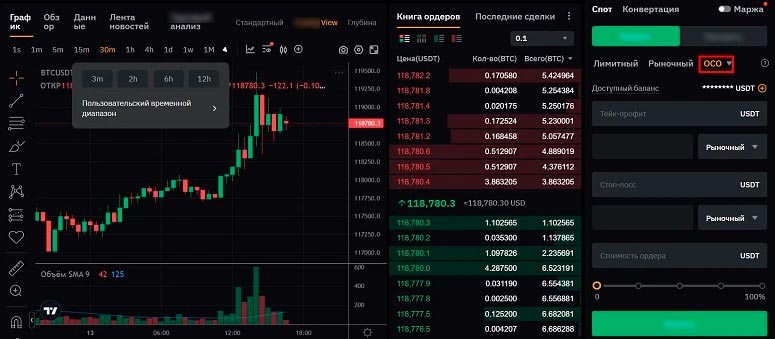 Использовать ордер OCO можно только на споте. Алгоритм действий после перехода в терминал с нужной криптовалютной парой следующий:
