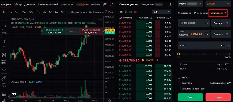 При торговле деривативами триггер-цену можно применять только с условным ордером, Take-Profit и Stop-Loss. Ниже разобран порядок действий для каждой из разновидностей.