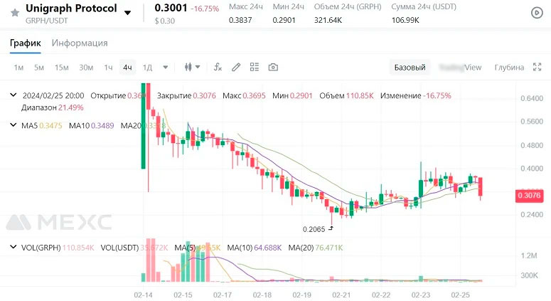 Пока протокол находится в разработке, команда продвигает нативный токен GRPH. Сначала криптовалюту запустили на сетевой DEX Unisat. Затем проект поддержали ведущие биржи OKX, MEXC, Bitget. В феврале 2024-го токен торгуется относительно небольшим объемом — $538,76 тыс. в сутки. Но Unigraph находится на начальном этапе развития. После запуска бета-версии и основой сети для BRC-20 его популярность может значительно вырасти.