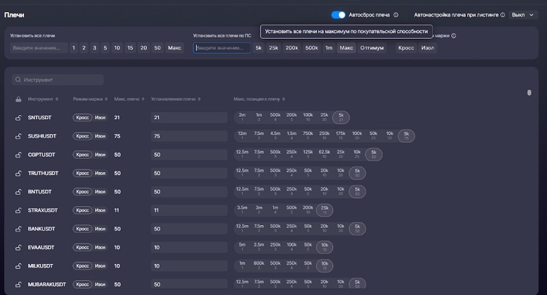 Трейдер может блокировать определенный торговый инструмент от массовых изменений, выбрав иконку с замком возле него. Предусмотрен автосброс плеча в случае, если биржа снижает его без предупреждения.