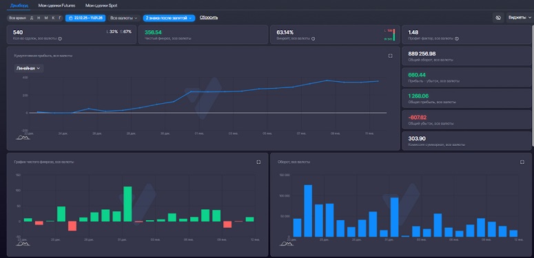 - Личный кабинет, интегрированный сразу с несколькими крупными биржами. В нем есть бесплатный дневник сделок, автоматический риск-менеджер, система бонусов от наторгованных комиссий.