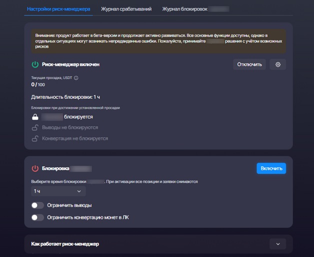 Отсчет просадок стартует от начала дня при первой активации с учетом внутрисуточных торговых результатов. Отключать риск-менеджер или корректировать его параметры можно только 1 раз в 24 часа. Размер просадки задается в USDT. Скорректировать его через службу поддержки нельзя.