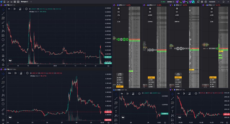 Поддерживается связка нескольких окон между собой. Если пользователь выбирает определенный торговый инструмент, терминал автоматически открывает соответствующий график со стаканами для спота и фьючерсов. Таким образом можно быстро переключаться между разными активами.