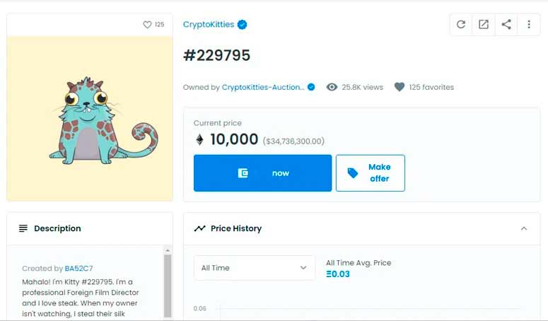 В 2021 году невзаимозаменяемые токены оказались в центре внимания. NFT обрели популярность благодаря блокчейн-игре Crypto Kitties. Пользователи создавали и разводили уникальных цифровых кошек. Чтобы обновить своего питомца, они покупали фичи (дополнительные функции) и платили за них ETH. Каждая кошечка имеет набор атрибутов и уникальный номер.