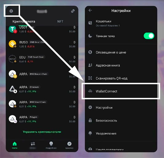 Несмотря на отличия в интерфейсе сервисов, кнопку интеграции почти всегда можно найти в главном меню. Для примера рассмотрен сервис Trust Wallet. Инструкция, как подключить его к Uniswap с помощью WalletConnect: