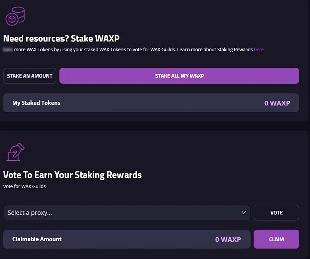 Чтобы поместить токены в стейкинг, нужно зайти в раздел Staking Rewards и кликнуть по Stake More Tokens. Взамен пользователям начисляются вознаграждения в виде монет WAXP и ресурсов CPU или NET. Чтобы вывести активы, нужно нажать на Claim Earnings.
