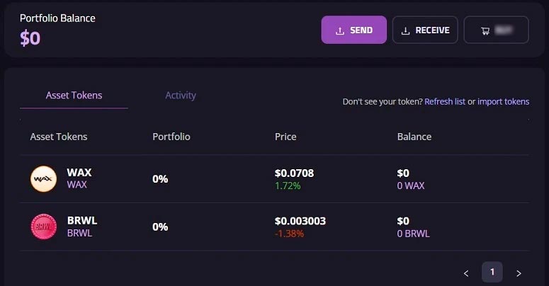 В сервисе можно хранить только монеты, созданные на блокчейне Worldwide Asset eXchange. По умолчанию на официальном сайте кошелька Wax Wallet отображаются криптовалюты WAXP и BRWL. Первая монета — это служебный токен блокчейна, который обеспечивает всю экосистему. Также можно добавить другие активы. Для этого необходимо: