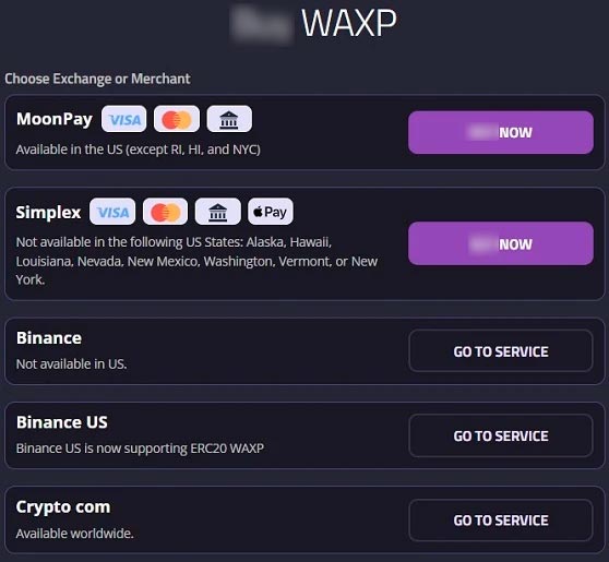 Еще один способ пополнить счет — приобрести токены в интерфейсе кошелька. Для этого на странице Dashboard нужно открыть раздел Buy. Отобразится список платформ, которые поддерживают WAXP.