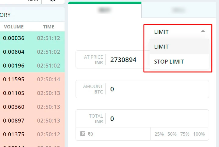 Для удобства разработчики разместили в этой форме кнопки с процентами. С их помощью можно одним кликом заносить в ордер часть депозита от 25 до 100%. Здесь же можно выбрать один из двух доступных видов — Limit или Stop Limit.