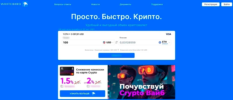 Это белорусский лицензионный сервис для конвертации криптовалют и фиатных средств. Он существует с 2020 года и принадлежит ЗАО «Уайт Берд», которое официально зарегистрировано и легально работает в республике. Обменник WHITEBIRD имеет понятный интерфейс, поддерживает все основные цифровые монеты, банковские карты Visa, Mastercard и Белкарт (Альфа-Банк Беларусь и Беларусбанк). Редакция выяснила, как пользоваться услугами этого сервиса, какие у него преимущества и есть ли недостатки. Обо всем можно узнать из обзора обменника на текущей странице.