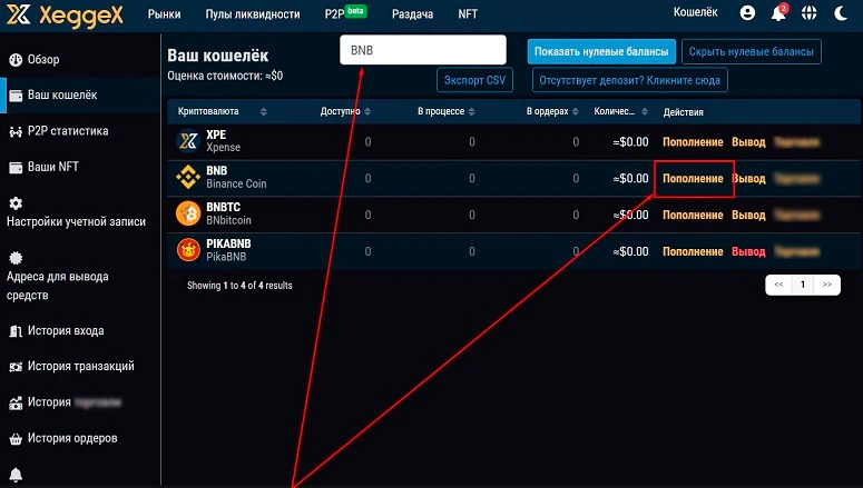 Вносить на баланс биржи можно только криптовалюты. Операции с традиционными деньгами проводятся на P2P-рынке.