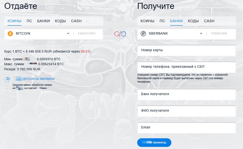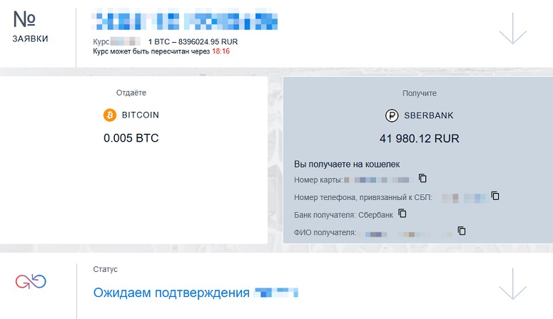 - Указать реквизиты для перевода средств. Например, при обмене биткоина на рубли СберБанка нужно ввести номер карты и телефон, привязанный к СБП. Также потребуется указать название банка, ФИО получателя и e-mail.