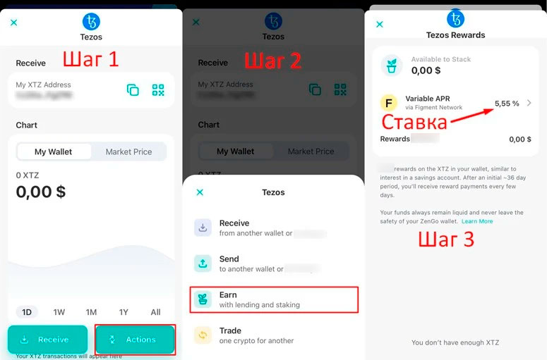 Размер вознаграждения со временем меняется. Например, текущая ставка за стейкинг Tezos составляет 5,55%. Чтобы внести монеты в протокол, нужно: